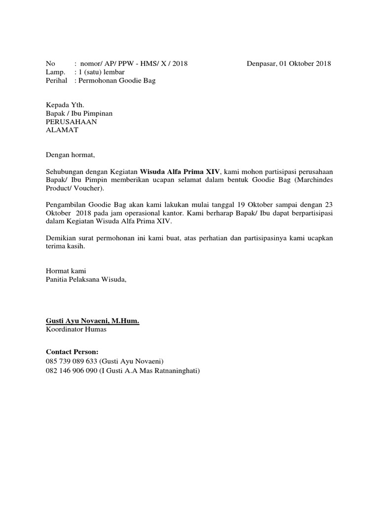 Adapun format surat permohonan antara lain yaitu sebagai berikut. Auditorium Kampus UNDIKNAS Denpasar Berkaitan dengan hal tersebut maka kami bermaksud memohon bantuan berupa Goodie Bag sebanyak 3 tiga buah sebagai cinderamata untuk diberikan kepada para juri undangan. Dalam menjalankan aktivitas sehari-hari acap kali ditemui kesalahpahaman maupun ketidaksepahaman antara satu pihak dan lainnya.